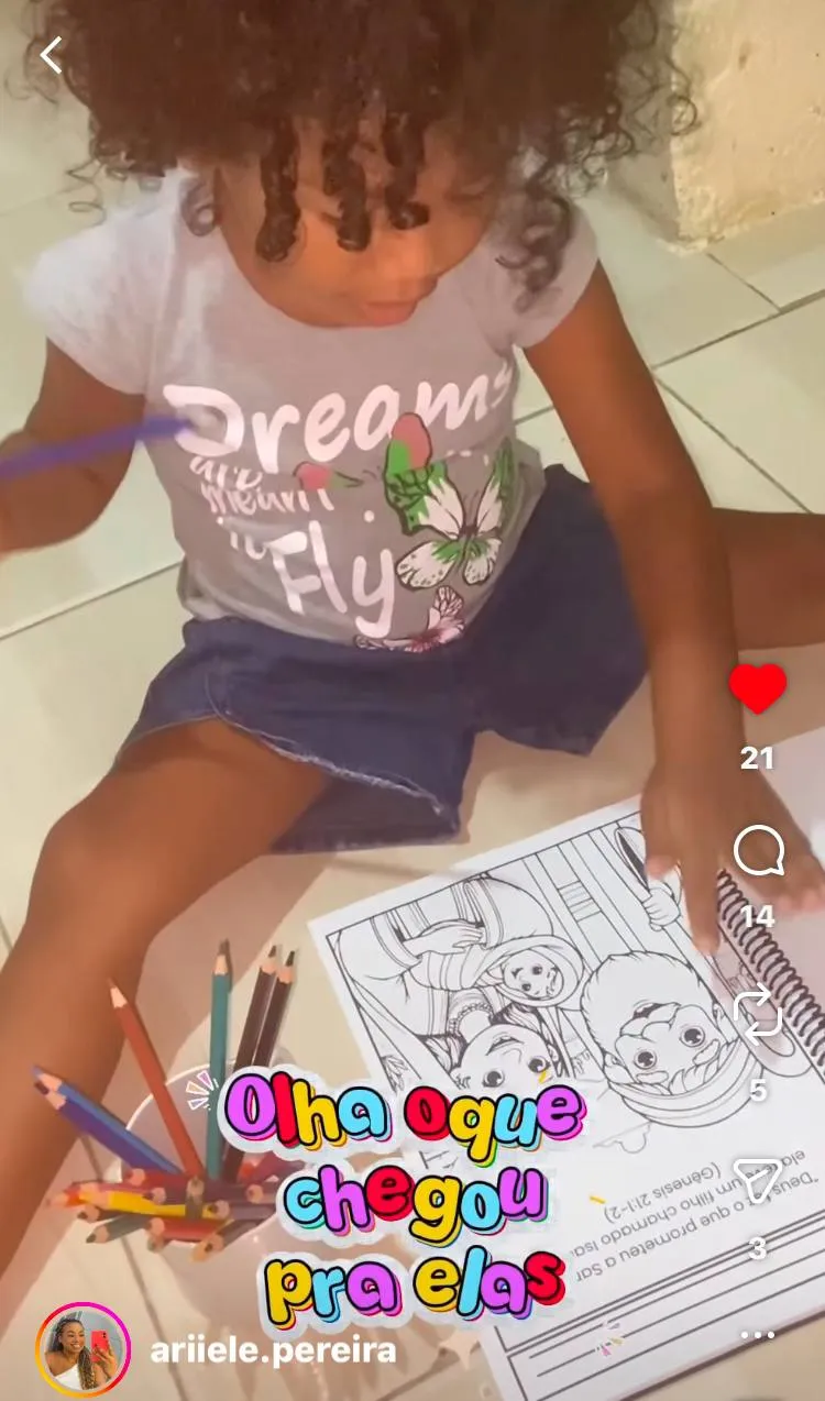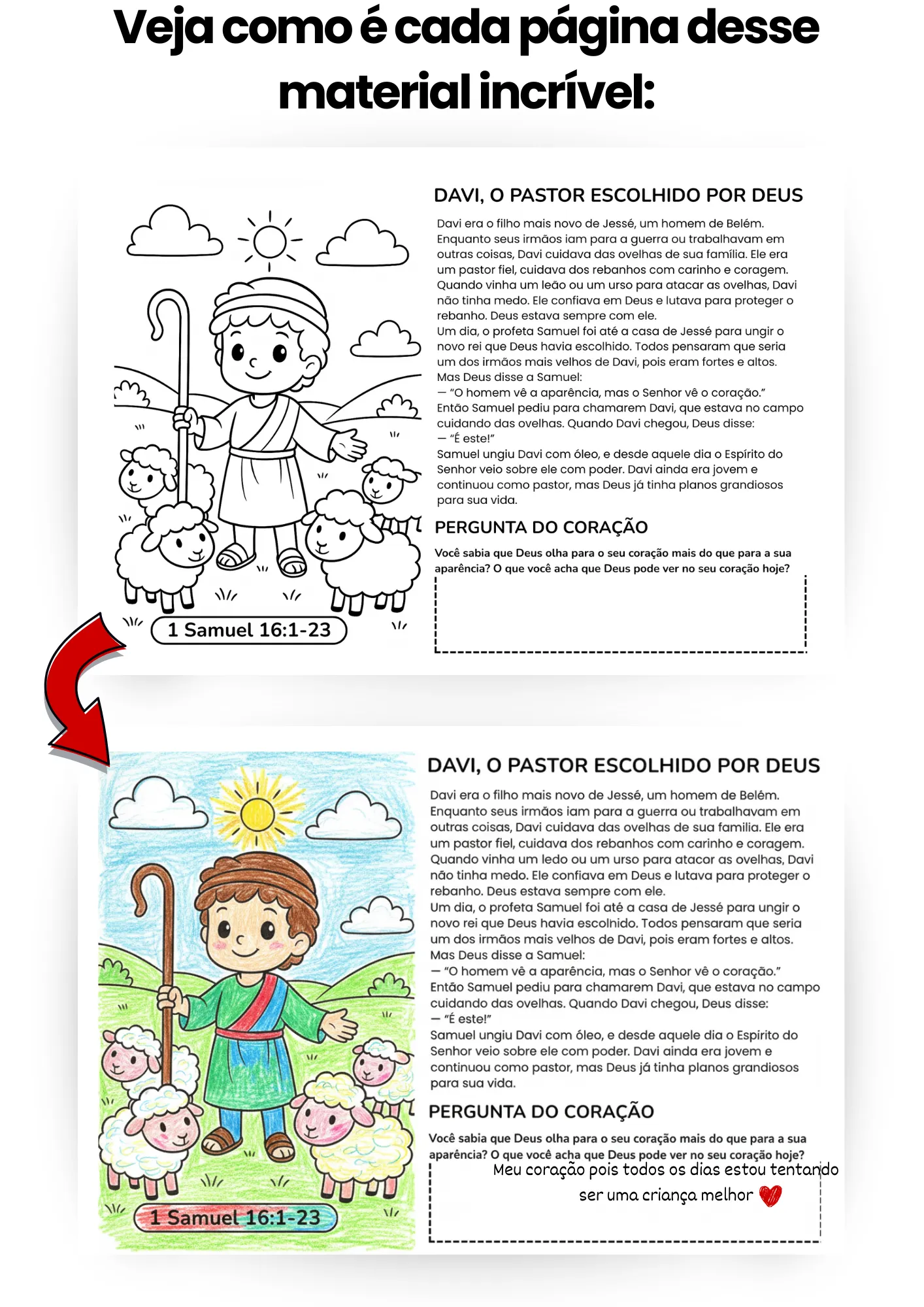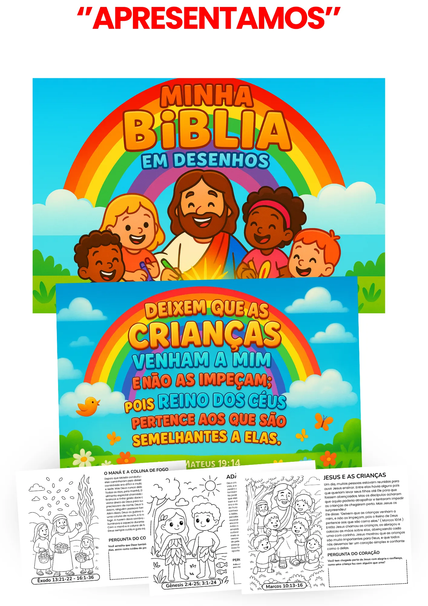 Nossa Bíblia em desenhos tem 187 páginas, todas com história do antigo ao novo testamente, desenho ilustrativos e uma pergunta do coração.